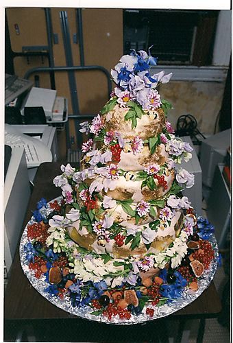 Our friend Linsey has posted on her blog about all the wedding cakes she’s baked. Turns out ours was the first, back in 1999 — and what a spectacular and delicious creation it was: “in the shape of a bee hive and… decorated with gold leaf and sugar bees. Sarah had made a bee painting and I wanted to try and capture its spirit in a cake. The cake itself was lemon and it was filled with ground pistachios and white chocolate mouse.” If I recall correctly, Linsey had to carry the layers of cake, frozen, as carry-on luggage in her suitcase from Chicago (or wait, where was she then? Atlanta possibly?); and then it was 99 degrees on our wedding (in July) and the cake was in constant danger of melting…