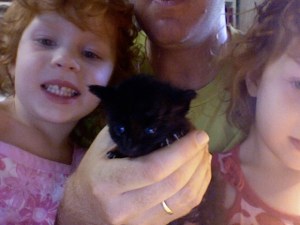 Sarah was visiting her friend Julie; Julie’s daughter Haley had brought this little guy home the day before — I think a teacher at Haley’s school had found an abandoned litter. We have not yet formally committed to keeping him permanently and as far as Celie and Iris understand, it’s a foster care situation. Julie and Haley were calling him “Dito” which I don’t think we’re going to retain. The girls seems to want to call him something like Blackie, but we’re trying to steer them gently away from that. (Oy, just thought about the Obama speech context — OK, any “Blackie”-type name is definitely off limits. Maybe Hope or Change?)