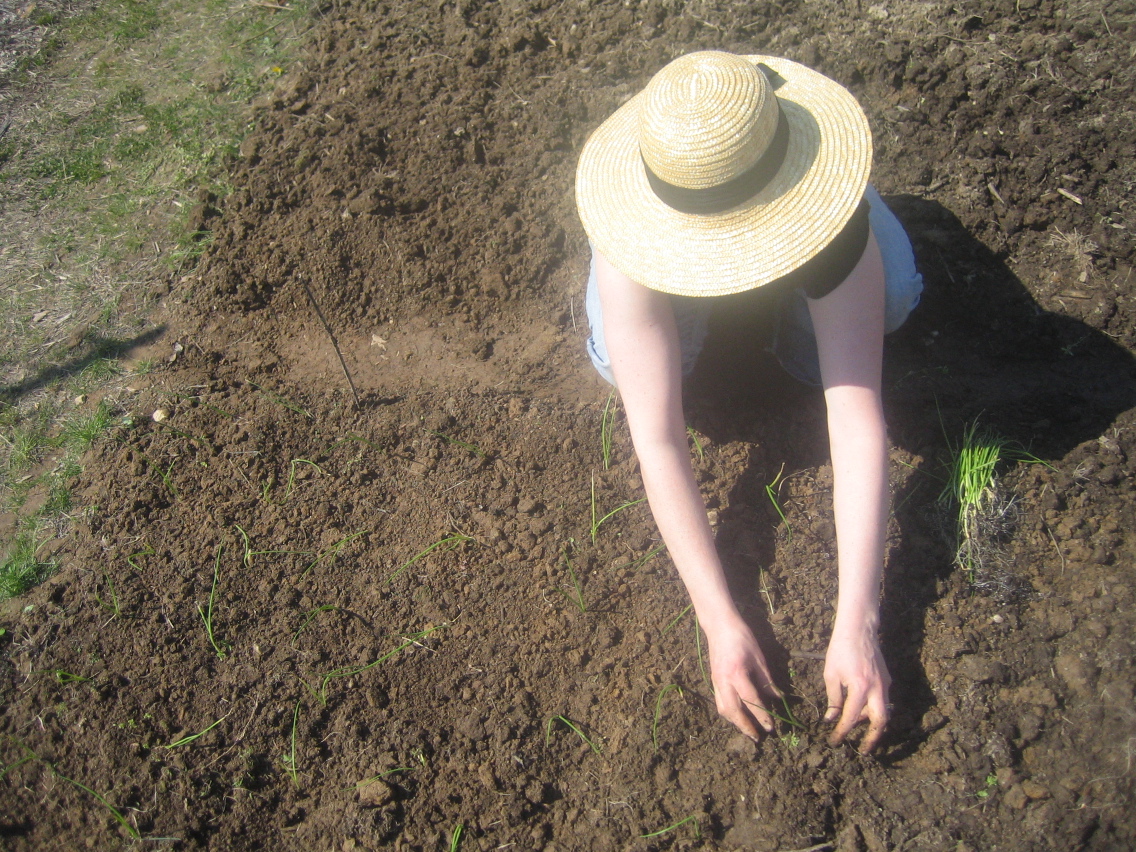 Sarah took the plunge and joined in on a community garden plot. Or rather, 4 plots, I believe, as part of a team of five people. Here she is planting some onions.