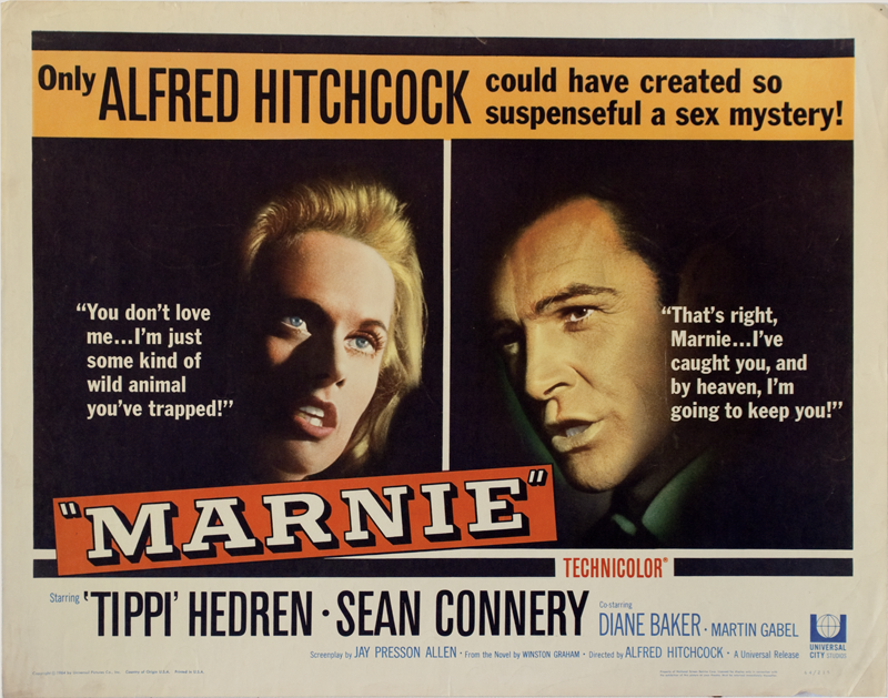 Re: Marnie’s line in the poster, “I’m just some kind of wild animal you’ve trapped,” Connery’s character alludes early on to a jaguarundi he captured and raised as a pet, but disappointingly, this is last we hear about it; I was hoping for a noir Bringing Up Baby angle there.